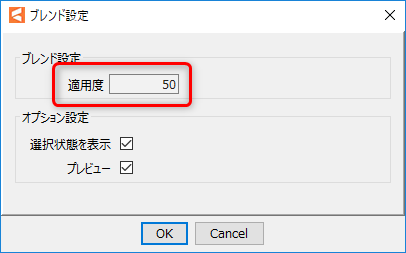 ブレンドの加減は、ブレンド設定の適用度に数値を入力することで変更できます。