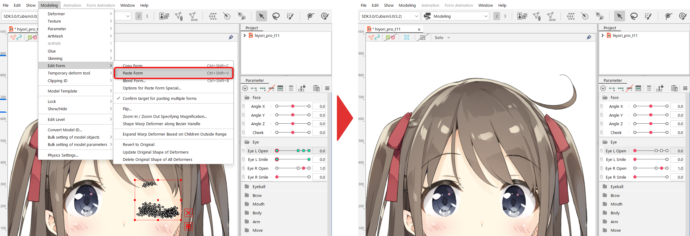 Objects such as ArtMeshes and deformers can be inverted, and forms can be copied/pasted/blended.