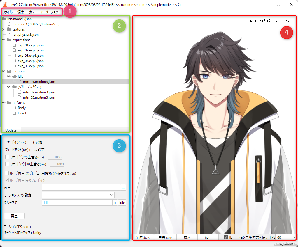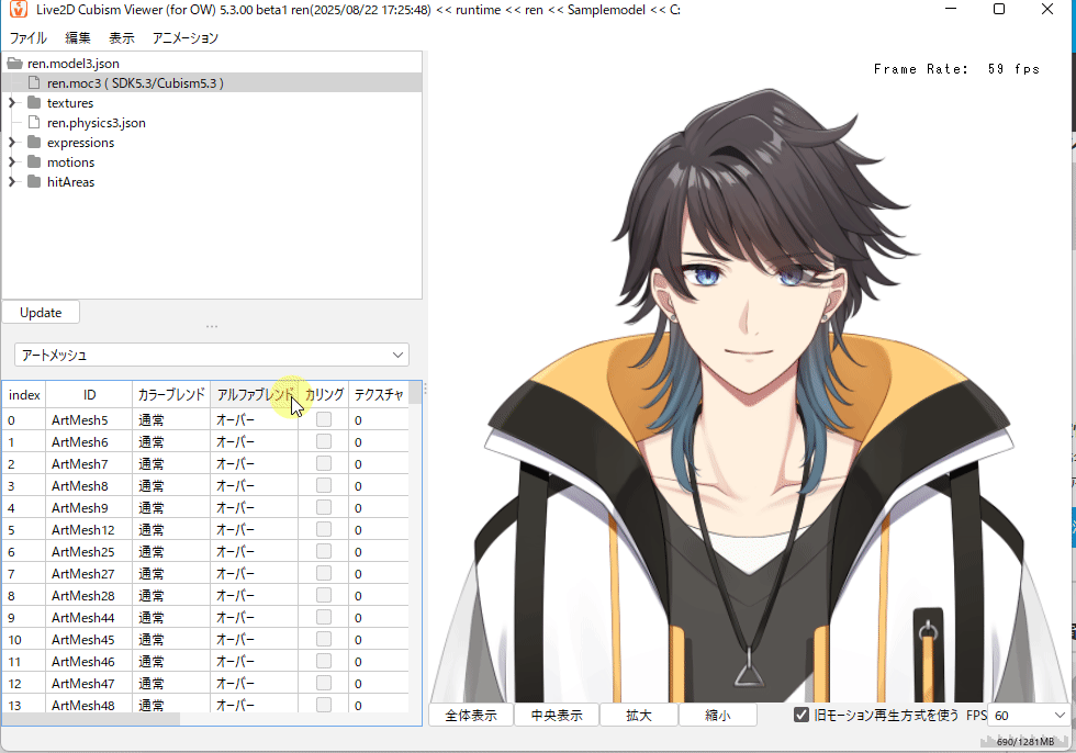 Cubism Viewer (for OW)では、以下のようなモデル表示の再生等を確認することができます。