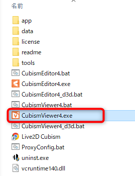 展開後は、実行ファイルと同じ階層に配置されていますので、CubismViewerの.exeファイルを起動します。