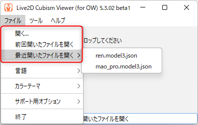 「.moc3 」または「 .model3.json」ファイルをドロップすることでViewerが起動します。