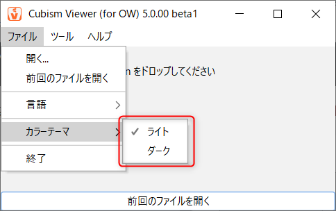 [ファイル]メニュー→[カラーテーマ]から[ライト][ダーク]のカラーテーマを切り替えることができます。