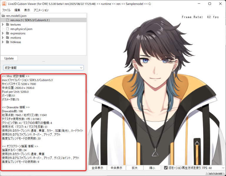 MOC3ファイルの統計情報からターゲットバージョン等の情報を確認できます。