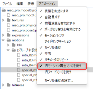 | 旧モーション再生方式を使う | 旧モーション再生方式を有効にします。 モデル表示エリアの右下にある[旧モーション再生方式を使う]にチェックが入ります。 詳しい説明は「motion3.jsonの再現性が劣化する場合について」のページをご覧ください。 |