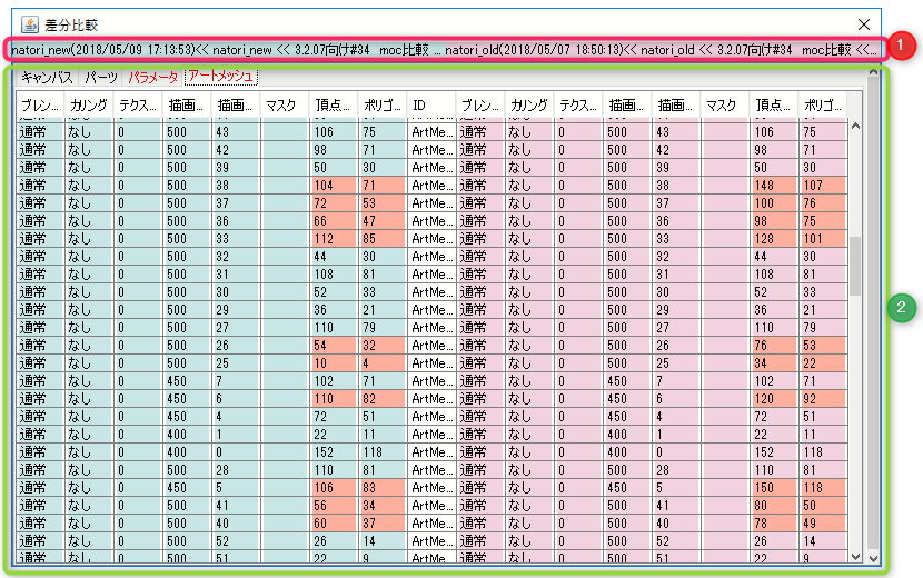 | 差分比較 | 2つのMOC3データの情報をViewer上で比較確認することができます。 詳細は「2つのMOC3データ情報の比較」をご覧ください。 |