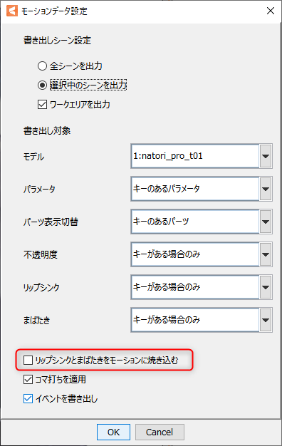 この項目を有効にすると、「リップシンク」と「まばたき」が個別に.motion3.jsonに書き出されなくなりますので、項目がグレーアウトします。