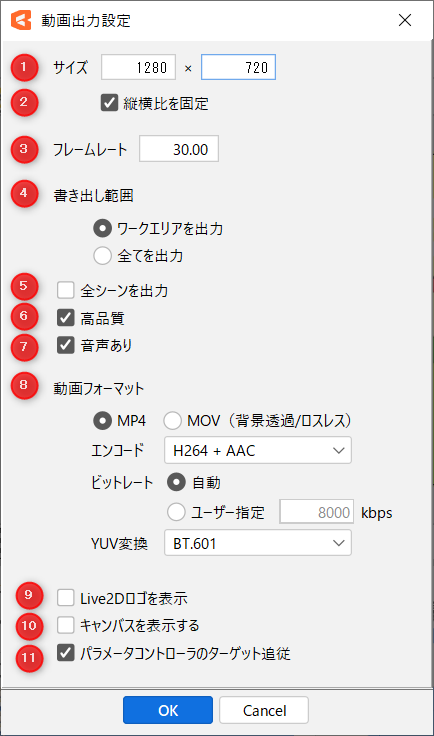 | ⑩ | Live2Dロゴを表示 | Live2Dロゴを載せて書き出します。 |