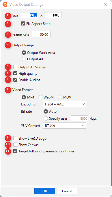| (10) | Show Live2D logo | Export with Live2D logo displayed. |