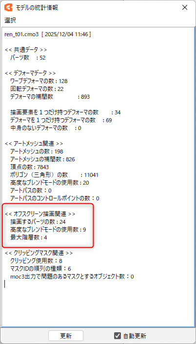 [ファイル]メニュー →[モデルの統計情報]から、オフスクリーン描画の描画するパーツの数などを確認できます。