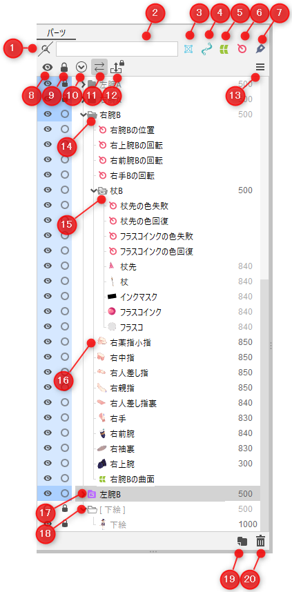 | 16 | オブジェクトの種別を表すアイコン/オブジェクト名/描画順 先頭のアイコンは、アートメッシュの場合は画像のサムネイルが表示されます。 |