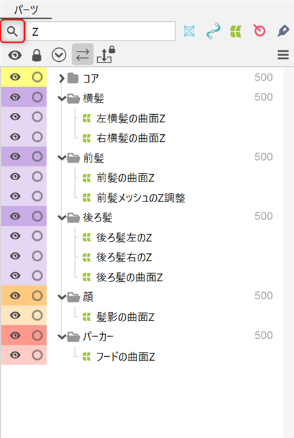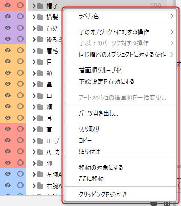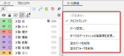 ただし、同じ描画順のアートメッシュについては、パーツパレット内でより上にあるものがキャンバス上でも前面に表示されます。