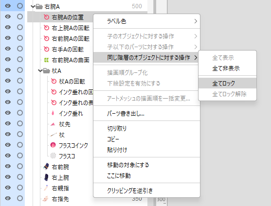 オブジェクトを選択した状態で右クリックし、コンテキストメニューから[同じ階層のオブジェクトに対する操作]を選択すると同じ階層のオブジェクトに対して表示状態、ロックの切り替えを一括で行うことができます。