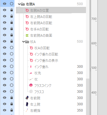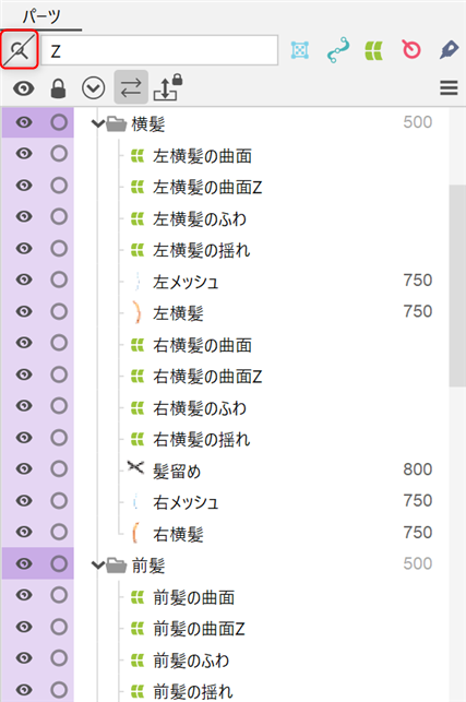 パーツ内で各オブジェクトのボタンをクリックすると、個別に表示/非表示、ロック/ロック解除、展開/折りたたみを行うことができます。