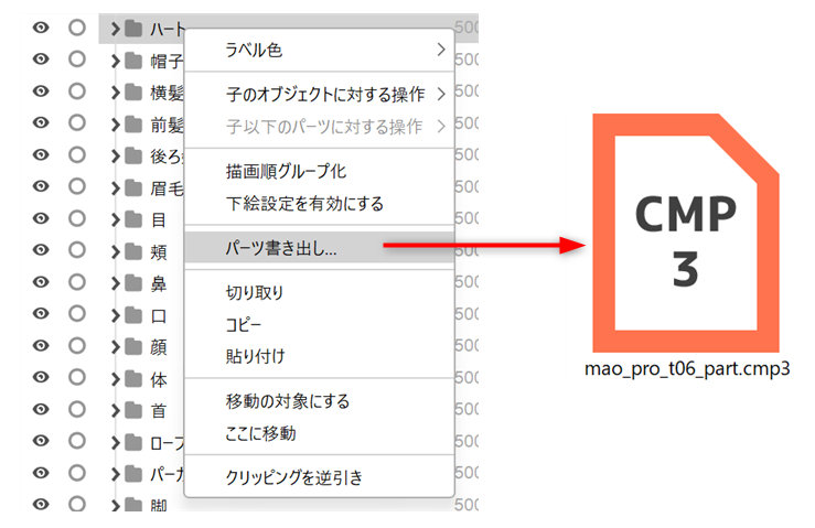 パーツを選択した状態で右クリックし、コンテキストメニューから[パーツ書き出し]をクリックすると、モデルの一部をパーツデータ(.cmp3)として保存します。