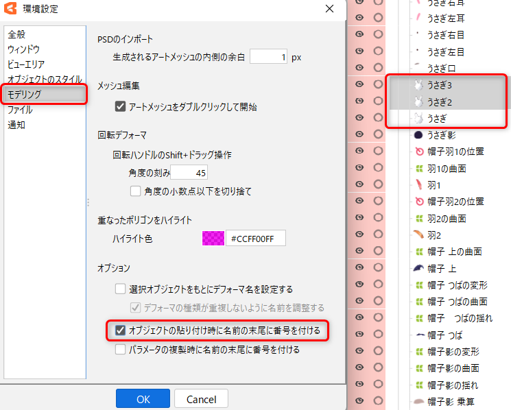 [モデリング]にある[オブジェクトの貼り付け時に名前の末尾に番号を付ける]のチェックをON/OFFしてください。