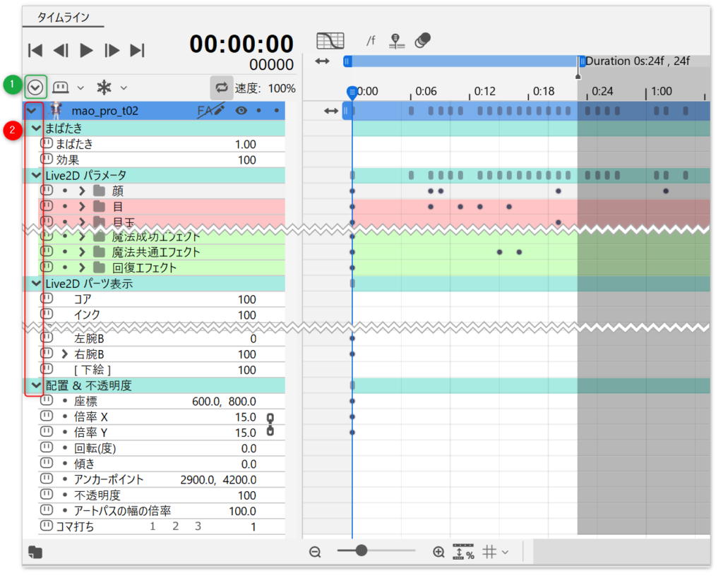 画像内①または②の[開閉ボタン]をクリックすると、トラックやプロパティグループが展開されます。