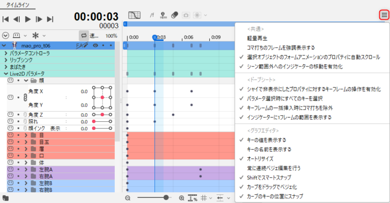 基本操作については「ドープシートの基本操作」「グラフエディタ」をご覧ください。
