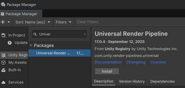 これまで利用していたBuilt-in Render PipelineはURP向けのパッケージがBuilt-in Render Pipelineと互換性がないため利用できません。