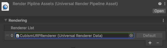 作成したUniversal Renderer PipelineアセットのRendering/Renderer Listに CubismURPRenderer.asset を設定します。