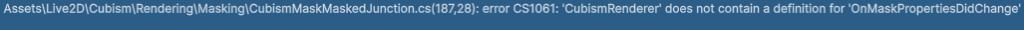- Assets/Live2D/Cubism/Rendering/Masking/CubismMaskMaskedJunktion.cs でCubismRenderer.OnMaskPropertiesDidChange() が見つからないというエラーの出る箇所をコメントアウト、あるいは削除