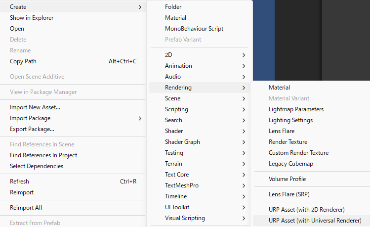 Projectウィンドウのコンテキストメニュー内の Create/Rendering から URP Asset (with Universal Renderer) を選択して、Universal Renderer Pipelineアセットを作成します。