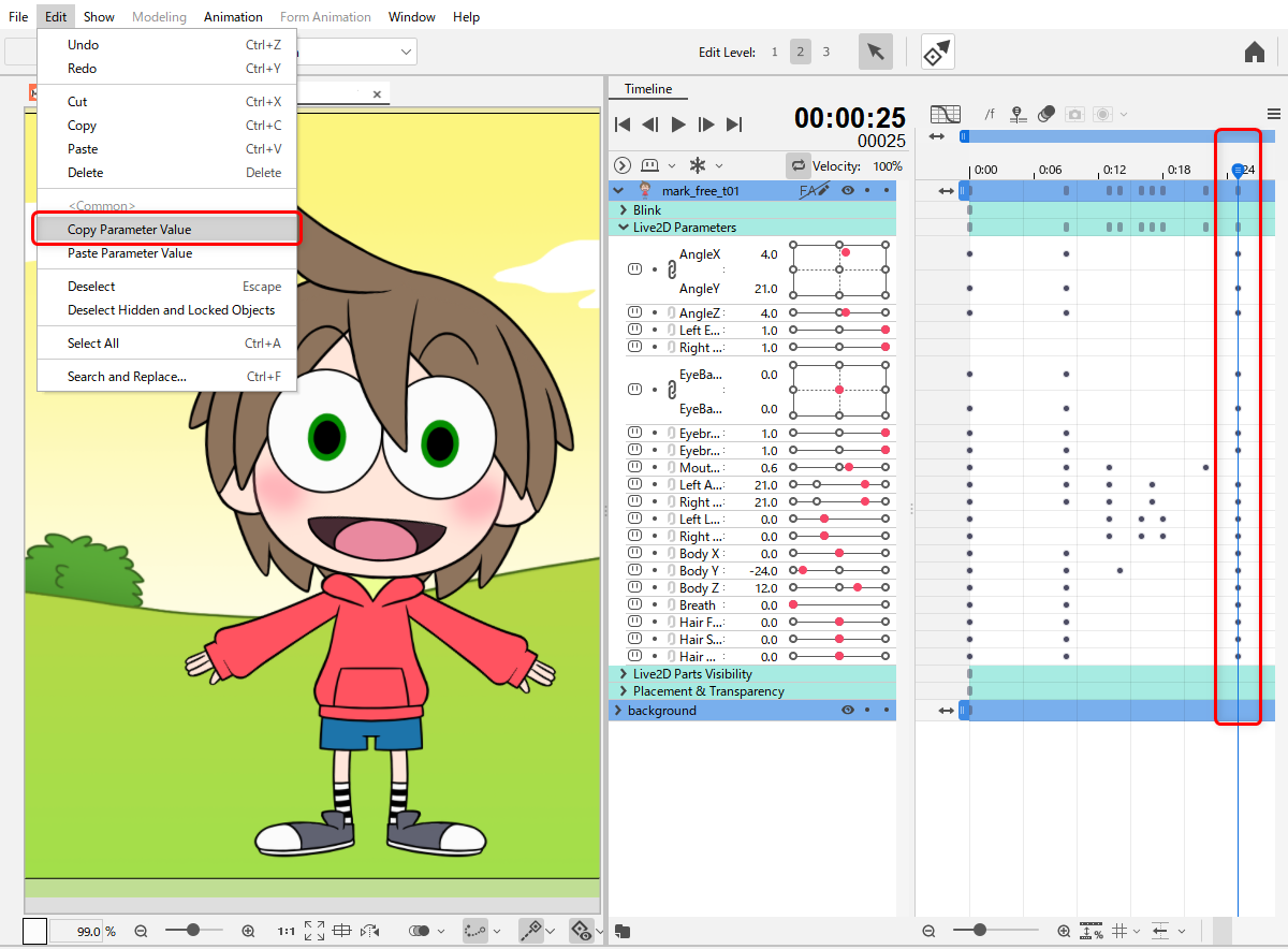 Under [Paste Parameter Value], select the timeline location where you want to paste, and then click [Edit] menu -> [Paste Parameter Value].