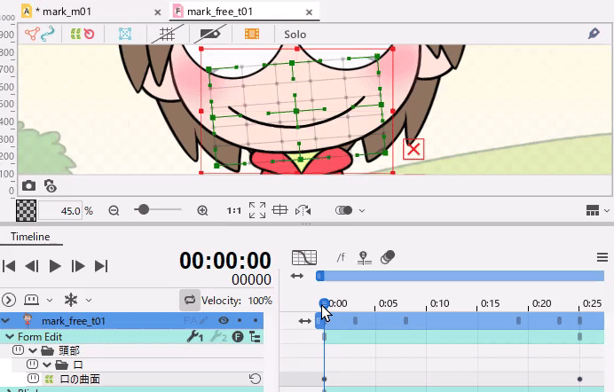 Do not perform the above operation on the Form Animation View, as it will affect the model data. - Form animations are edited with “Lock Default Forms” unlocked because forms can be freely transformed without parameter restrictions.