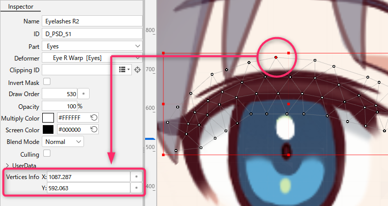 When you select a vertex in an ArtMesh or deformer, the [Vertices Info] at the bottom of the inspector palette displays the coordinates of the canvas.