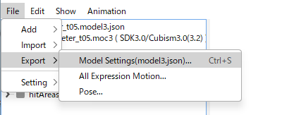 From the menu, click [File] -> [Export] -> [Model Settings (model3.json)].