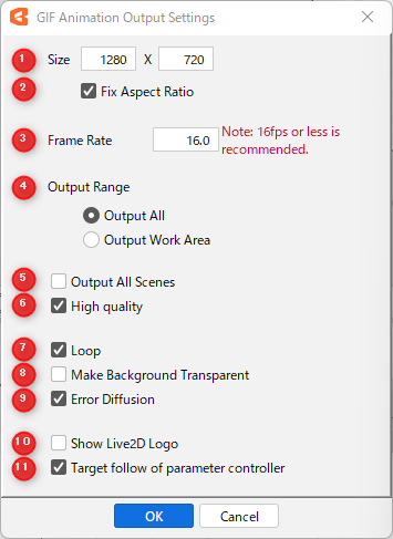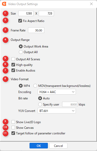| (10) | Show Live2D logo | Export with Live2D logo displayed. |