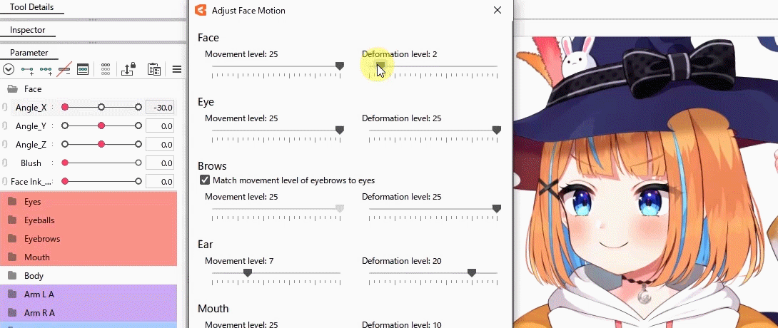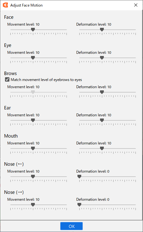 In the [Adjust facial motion] dialog box, use the sliders to adjust the deformation as you like.