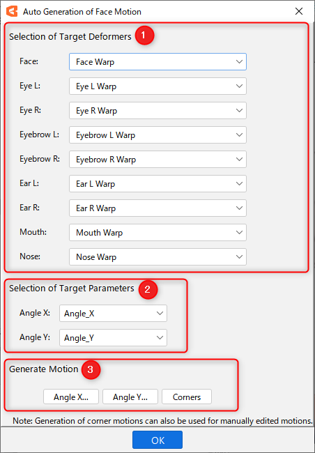 When clicked, the angle XY movement is generated for the parameters selected in (2), and the [Adjust facial motion] dialog box appears.