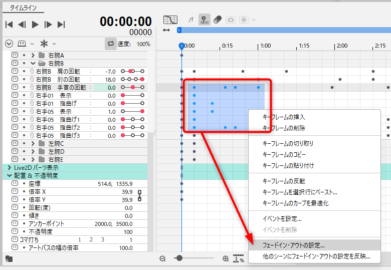 Next, select [Animation] menu -> [Fading] -> [Fade-in/out settings] to open the settings dialog box.