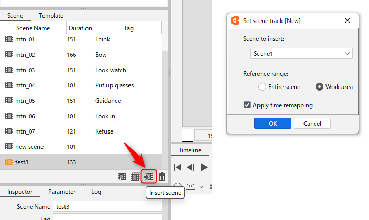 | 3 | Insert scene | Insert any scene into the selected scene. |