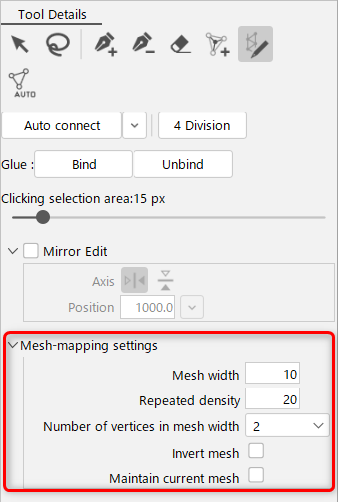 There are two types of mesh editing: “Auto Generation,” which can be generated automatically by simply specifying values related to the density of points, and “Edit manually,” in which points can be edited by clicking them one by one.