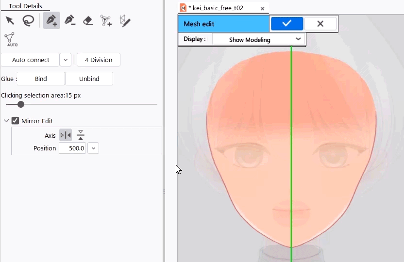 | Mirror edit | Edit vertices and edges in a symmetrical manner along a straight line. |