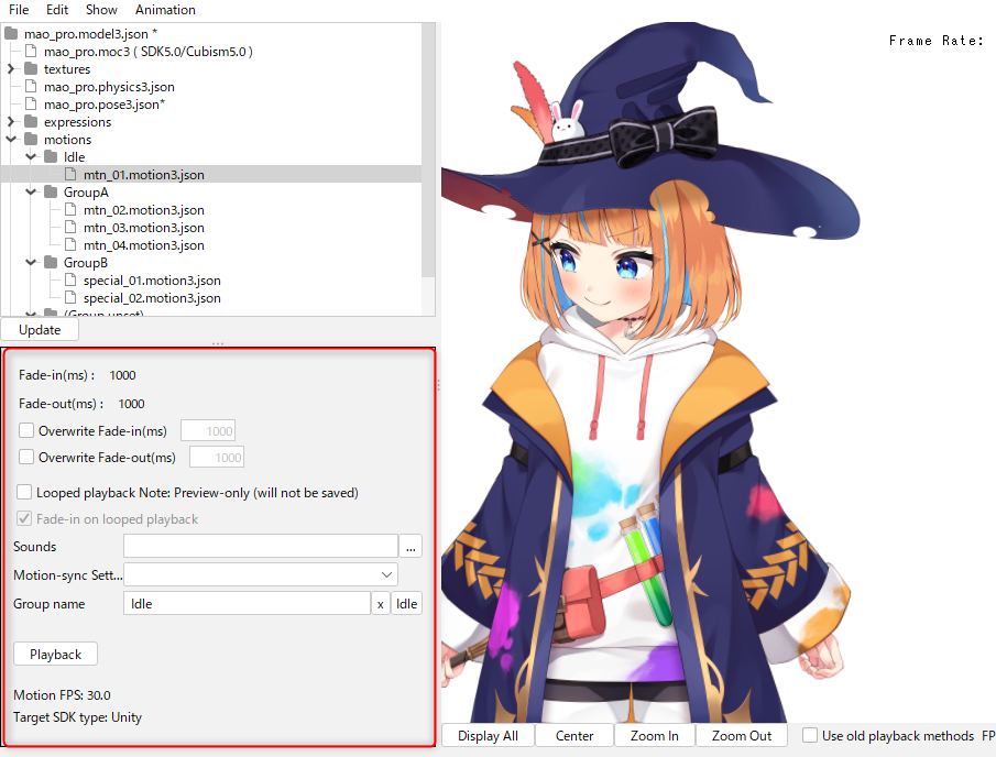 The fade-in values for the motion set in the .motion3.json file are displayed.