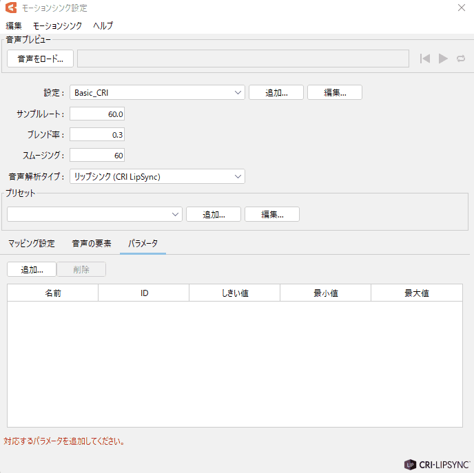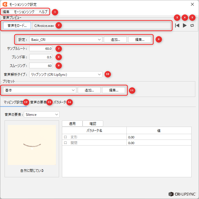 | (3) | Vowels only (blend shape) | If you want to create a parameter for each viseme, this preset is recommended.![]() |