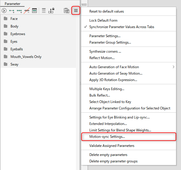 Alternatively, the dialog box can be accessed via the [Modeling] menu -> [Parameter] -> [Motion-sync Settings].