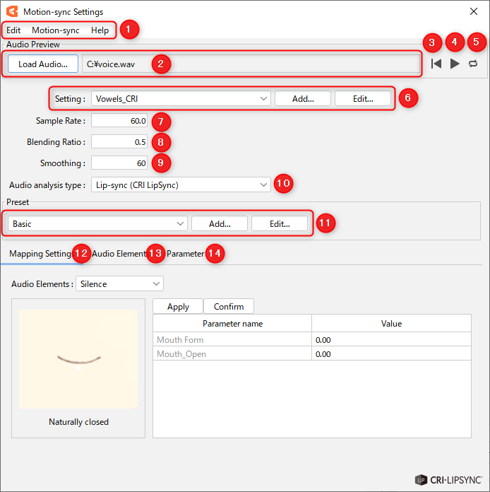 | (10) | Audio analysis type | Select a library for audio analysis. Note: Currently, only [Lip-sync (CRI LipSync)] can be selected. Lip-sync (CRI LipSync): All platforms are supported. |