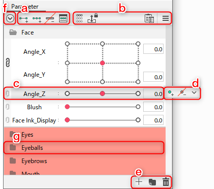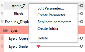 | (2) | Parameter name | Display parameter names. Right-click on the name to display the following menu. ![]() Edit Parameter: [Edit Parameter] dialog box opens. ![]() Name: The name of the parameter. Can be set to any desired setting. ID: The ID of the parameter. Although you can set any IDs you want, we recommend using the IDs in the “Standard Parameter List” if there are no rules in the specifications. Minimum, Default, Maximum: Minimum, default, and maximum values for parameters can be set. Although the range of parameter values can be set as desired, we recommend using the values in the “Standard Parameter List” if there are no specific rules in the specifications. Repeat: Check this box if you want to set a repeat (loop setting) for the parameter. See “Repeat” for more information. Blend Shape: Check this box if the parameter is for a Blend Shape. See “Blend Shape” for details. ID rule display: The [About IDs] dialog box opens. Create Parameter: [Create New Parameter] dialog box opens. Replicate parameters: Duplicate parameter settings only. Objects and keyforms are not duplicated. Create folder: Create a new parameter group. Group names are created automatically, but can be changed by double-clicking on the name. Delete: Click on a parameter or parameter group with it selected to delete the parameter. If a group is deleted with parameters in it, the parameters inside the group will be deleted. |