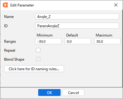 | (2) | Parameter name | Display parameter names. Right-click on the name to display the following menu. ![]() Edit Parameter: [Edit Parameter] dialog box opens. ![]() Name: The name of the parameter. Can be set to any desired setting. ID: The ID of the parameter. Although you can set any IDs you want, we recommend using the IDs in the “Standard Parameter List” if there are no rules in the specifications. Minimum, Default, Maximum: Minimum, default, and maximum values for parameters can be set. Although the range of parameter values can be set as desired, we recommend using the values in the “Standard Parameter List” if there are no specific rules in the specifications. Repeat: Check this box if you want to set a repeat (loop setting) for the parameter. See “Repeat” for more information. Blend Shape: Check this box if the parameter is for a Blend Shape. See “Blend Shape” for details. ID rule display: The [About IDs] dialog box opens. Create Parameter: [Create New Parameter] dialog box opens. Replicate parameters: Duplicate parameter settings only. Objects and keyforms are not duplicated. Create folder: Create a new parameter group. Group names are created automatically, but can be changed by double-clicking on the name. Delete: Click on a parameter or parameter group with it selected to delete the parameter. If a group is deleted with parameters in it, the parameters inside the group will be deleted. |