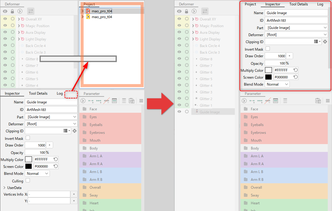 Drag the tab of the palette you want to move and drop it outside the window to make the palette appear in a stand-alone state.