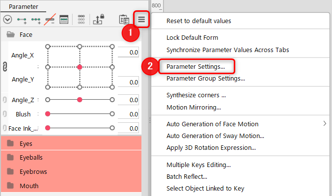 A parameter is a setting that expresses a specific movement, such as [Angle X] or [Mouth Open/Close].