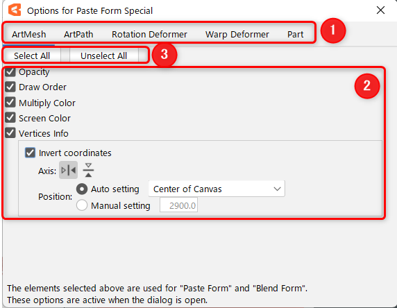 This function allows you to select arbitrary properties [Opacity], [Draw Order], [Multiply Color/Screen Color], [Vertices info], etc. when pasting a form into a keyform.
