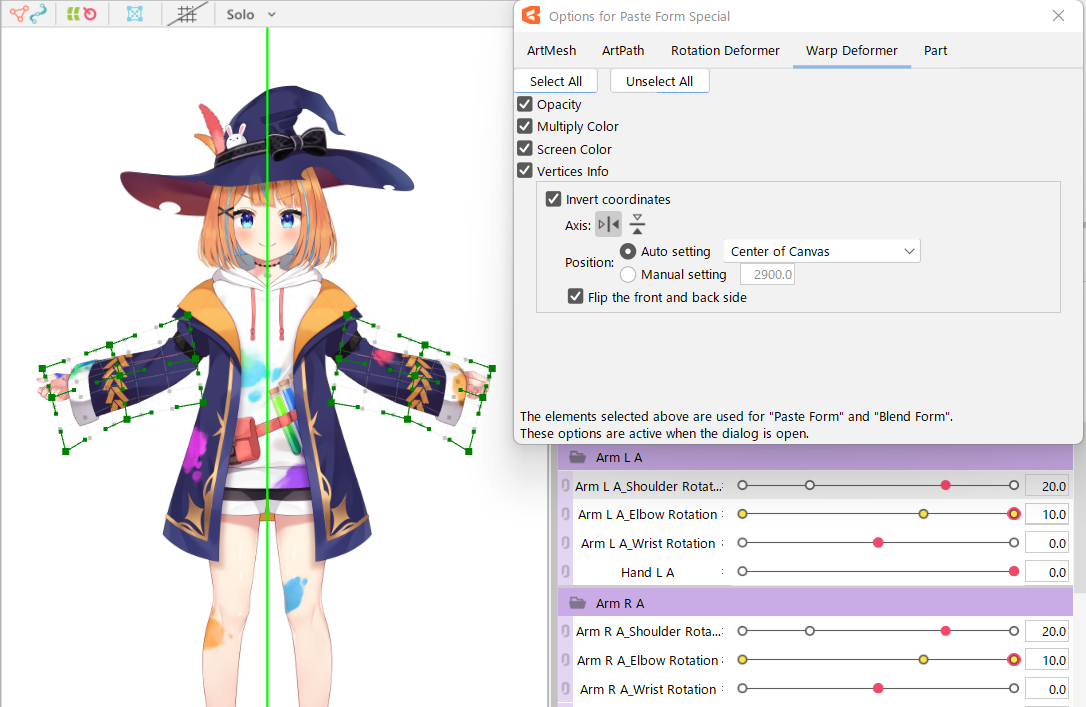 If you check the [Invert positive and negative] checkbox and execute [Copy/paste form], you can invert the angle of the Rotation Deformer and paste it as shown below.