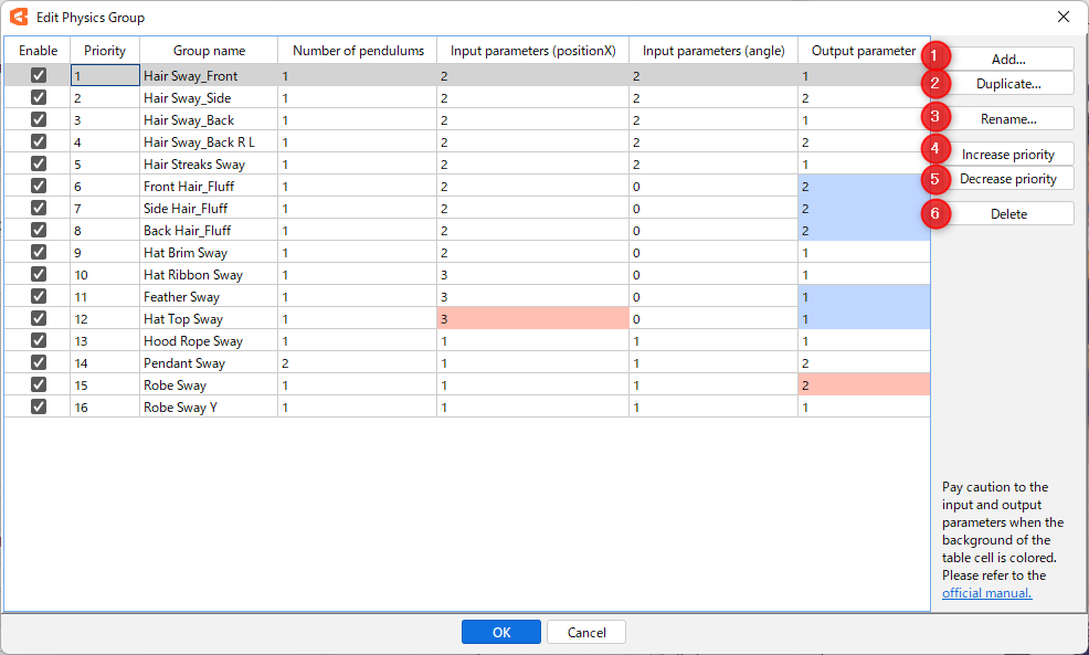 The [Edit Physics Group] dialog box allows you to add and rename physics groups, rearrange the order in which physics operations are processed, and check cautionary information.