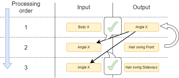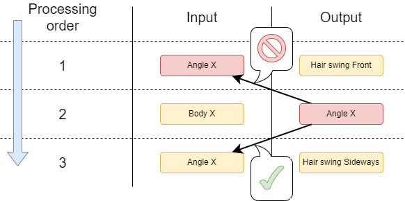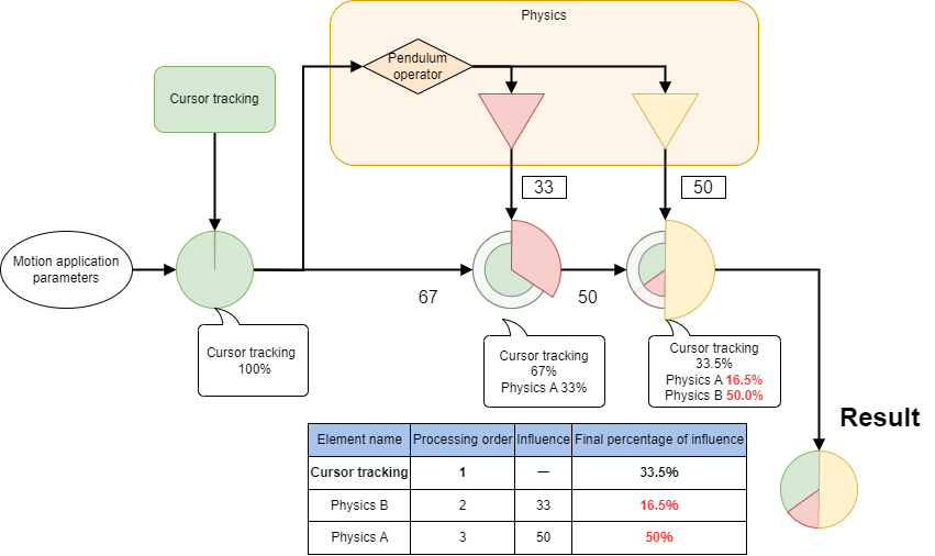 For example, if you have a pre-processing element, such as cursor tracking, and two physics groups, and you want them to affect each other equally, the appropriate influence is 50 for the first-processing physics operation A and 33 for the next-processing physics operation B.