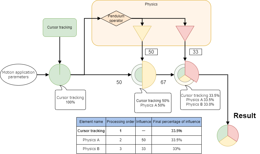 For example, if you have a pre-processing element, such as cursor tracking, and two physics groups, and you want them to affect each other equally, the appropriate influence is 50 for the first-processing physics operation A and 33 for the next-processing physics operation B.