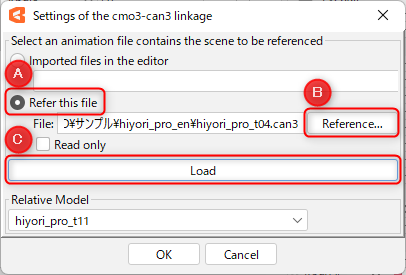 | (1) | ![]() | Load [CAN3]. Click on the [Playlist] menu → [Settings of the cmo3-can3 linkage]. If the Editor has already loaded [CAN3], select the file from the combo box under [Files loaded in the editor] and click [OK]. If [CAN3] is not open, select [Browse files] (A), then select the [CAN3] you want to open from [Reference] (B). Click [Load] (C) to display the [CMO3] associated with [CAN3] in the [Linked models] combo box. Select the model to be tied to the model data currently open in the Editor and click [OK]. |